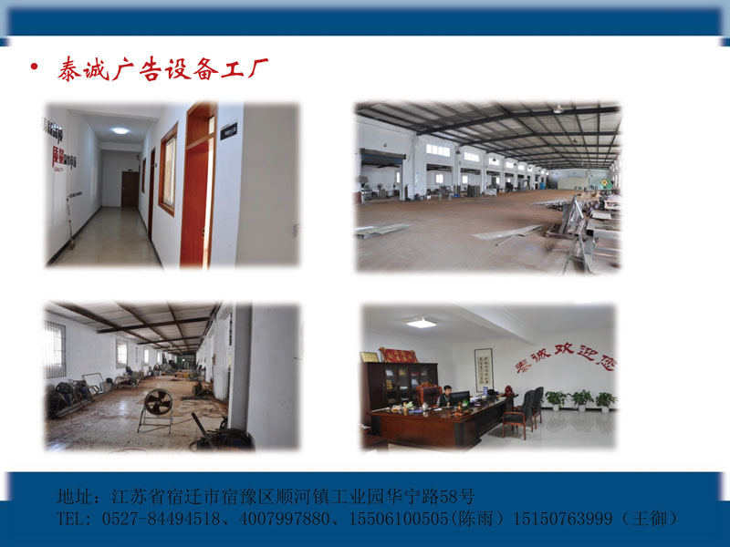 江蘇泰誠(chéng)科技設(shè)備有限公司是以候車亭、景觀燈箱、閱報(bào)欄、智能垃圾箱、標(biāo)識(shí)標(biāo)牌、指路牌、垃圾分類亭等設(shè)計(jì)、生產(chǎn)、銷售為一體的現(xiàn)代化廣告設(shè)備公司位于宿遷市宿豫順河工業(yè)園區(qū),交通十分便捷。